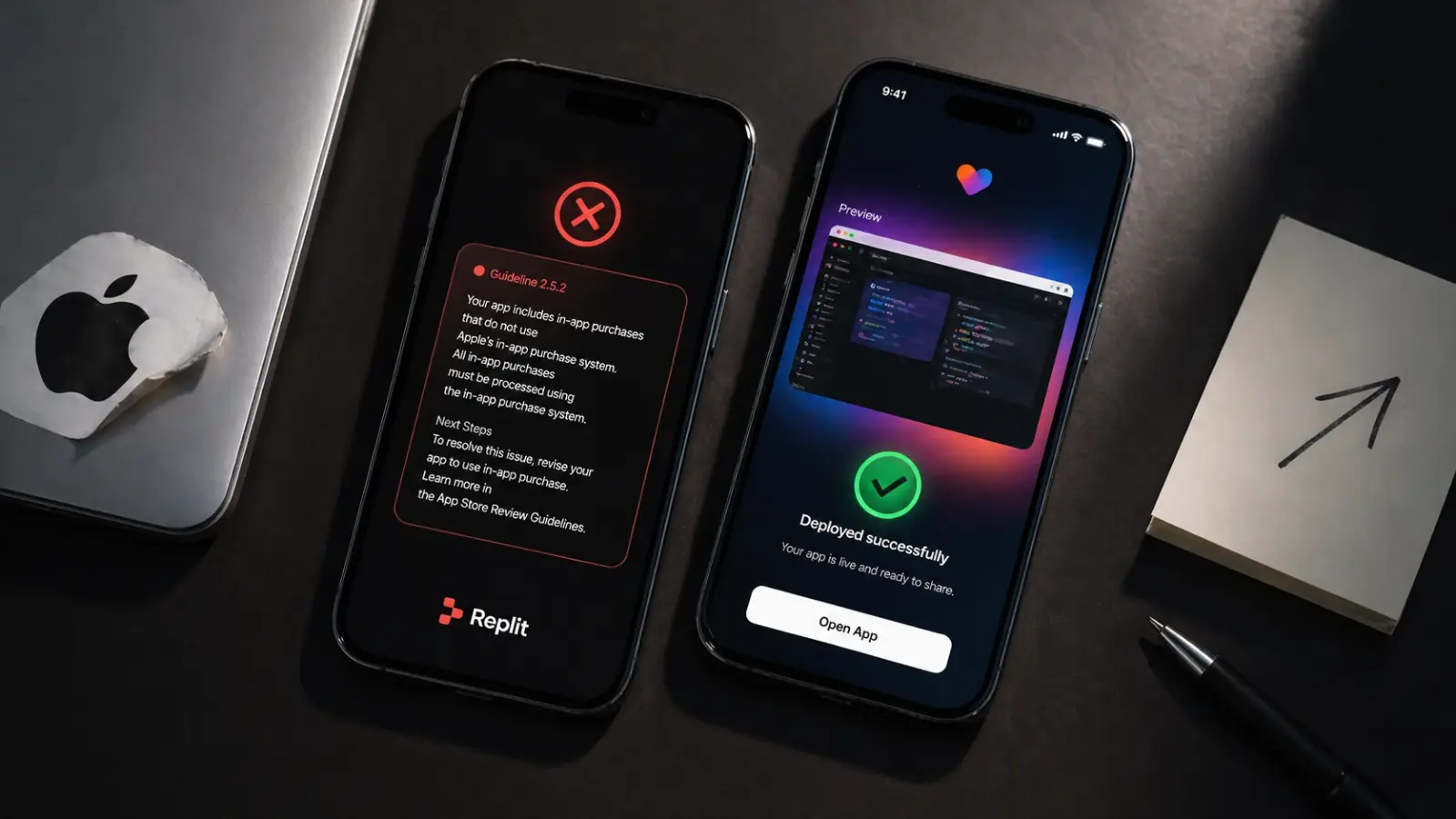 2026 metų kovo viduryje paaiškėjo, kad „Apple" tyliai blokavo atnaujinimus kelioms vibe coding programėlėms, tarp jų „Replit" ir „Vibecode", be jokio viešo paaiškinimo. Kūrėjai gaudavo atmetimo pranešimus, nurodančius 2.5.2 gairių pažeidimą.